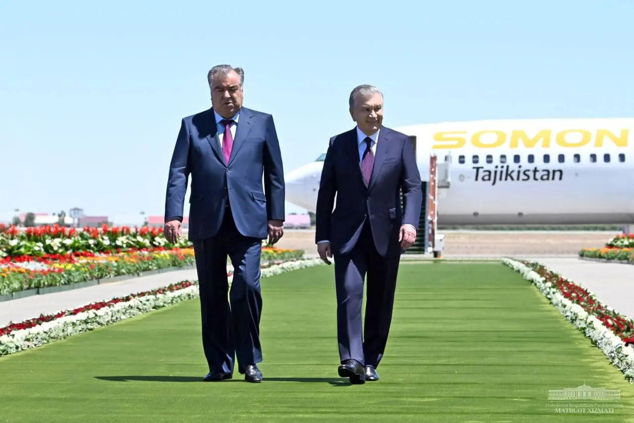 Davlatimiz rahbari Urganch xalqaro aeroportida Tojikiston Prezidenti Emomali Rahmonni kutib oldi