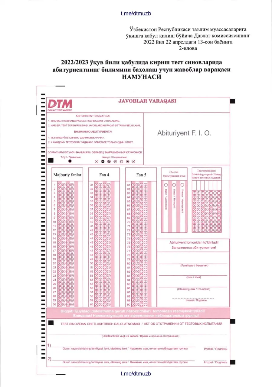 Bu yilgi test javoblar varaqasi namunasi tasdiqlandi