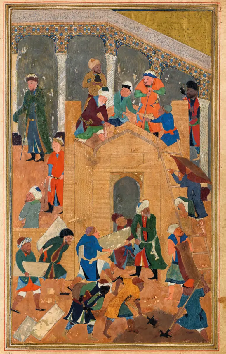 Behzod. Amir Temur Samarqanddagi jomeʼ masjidi qurilishini kuzatmoqda. (Zafarnoma, 1480-1485). Jon Xopkins universiteti kutubxonasi. (AQSH).