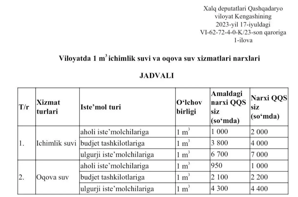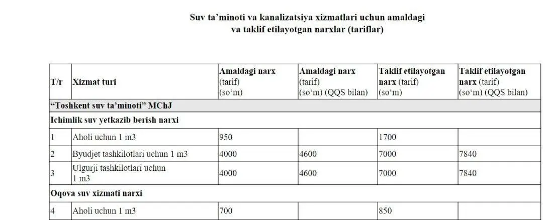 Xalq deputatlari Toshkent viloyati kengashining 25 iyuldagi qaroriga ko‘ra, 1 m³ ichimlik suvi narxi 950 so‘mdan 1 700 so‘mga, byudjet tashkilotlari uchun 4 000 so‘mdan 7 000 so‘mga oshirilishi ko‘rsatilgan. Yangilangan tariflar 20 avgustdan kuchga kirishi belgilangan.