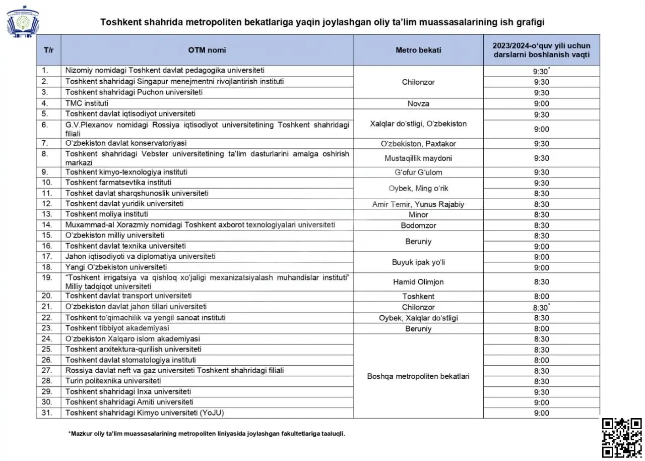 4-sentabrdan metro bekatlariga yaqin 31 ta OTMda dars jarayonining boshlanish vaqti ma’lum qilindi.