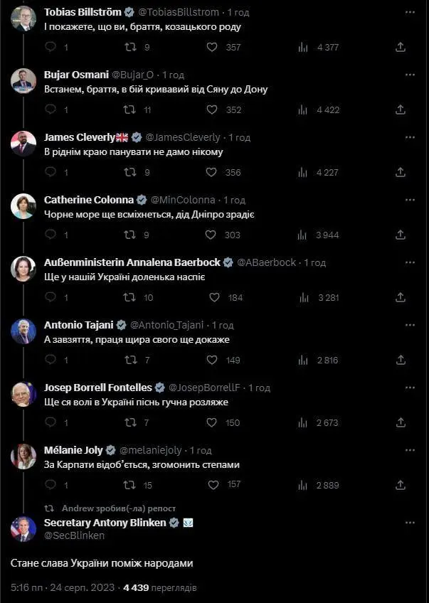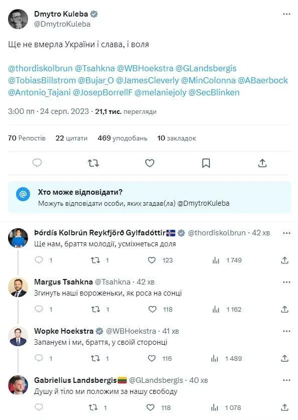Ukraina TIV rahbari Dmitriy Kuleba mamlakat mustaqilligi kuni munosabati bilan X‘da Ukraina madhiyasini bir satrdan yozib “kuylash”ni boshlab berdi.